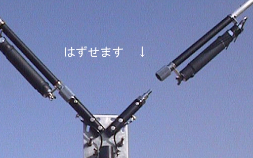 片側のエレメント長は約2.6m。先端のエレメントはモービルアンテナにも使われている、 ”ステンレス・エレメント”を採用、強度を保ったまま細く軽量に仕上がりました。そのため風の影響が少なく、取付・取外しもたいへん楽です。